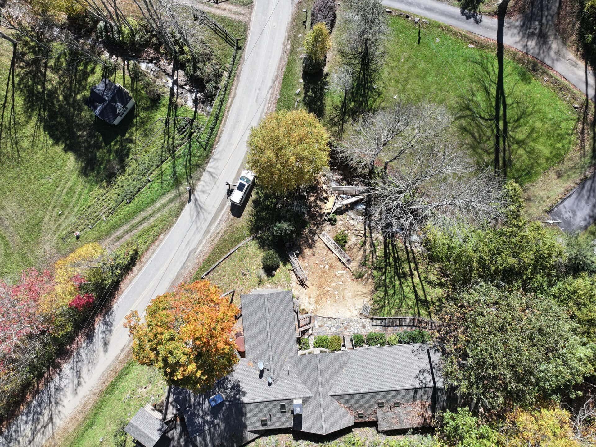 This vacation home’s steep slope in Maggie Valley, North Carolina, was in severe danger of collapsing after Hurricane Helene. The hurricane devastated the region in September 2024, damaging properties and destroying infrastructure with widespread flooding and erosion. Surging stormwater from a nearby stream caused major erosion, compromising the structure’s foundation, entrenched on the hillside.