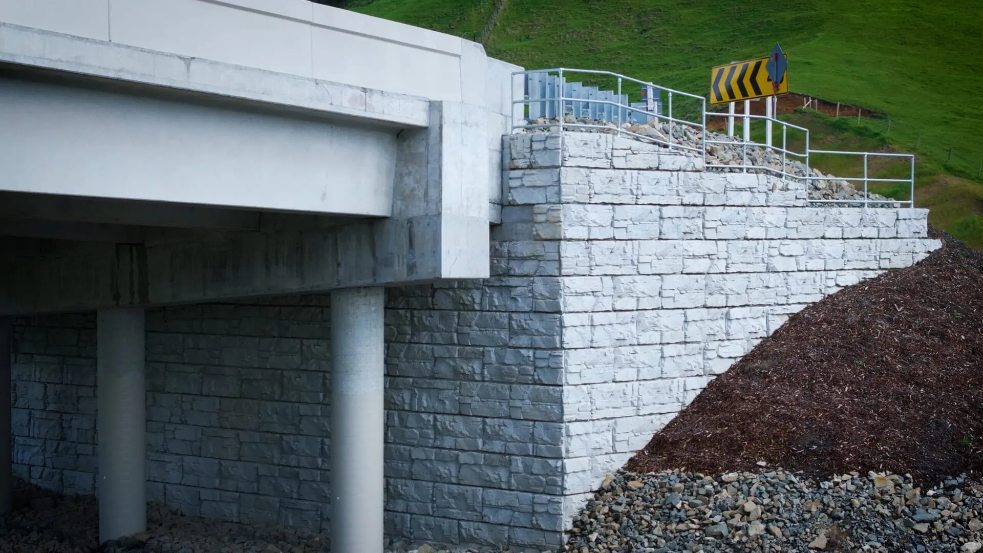 The Kopaki Bridge replacement represents another successful infrastructure application of the MagnumStone retaining wall system in New Zealand. With over 2,500 sq. ft. (232 sq. m.) of wall facing, the geogrid reinforced MagnumStone walls provided necessary strength, precision, and adaptability. The retaining walls capably constructed highway-supporting abutments in close proximity to Kopaki’s active railway — all while keeping construction simple, safe, and on schedule.