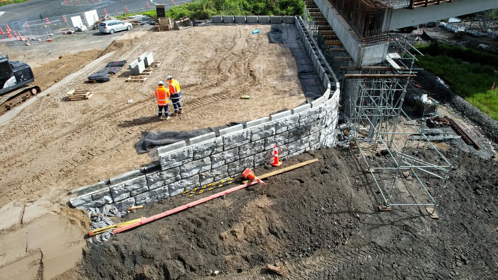 The Kopaki bridge abutments presented several unique challenges while constructing these two retaining walls. The combined expertise of Cirtex, Downer and CMW Geosciences easily found flexible solutions with MagnumStone’s geogrid reinforced system. Primary challenges included:
