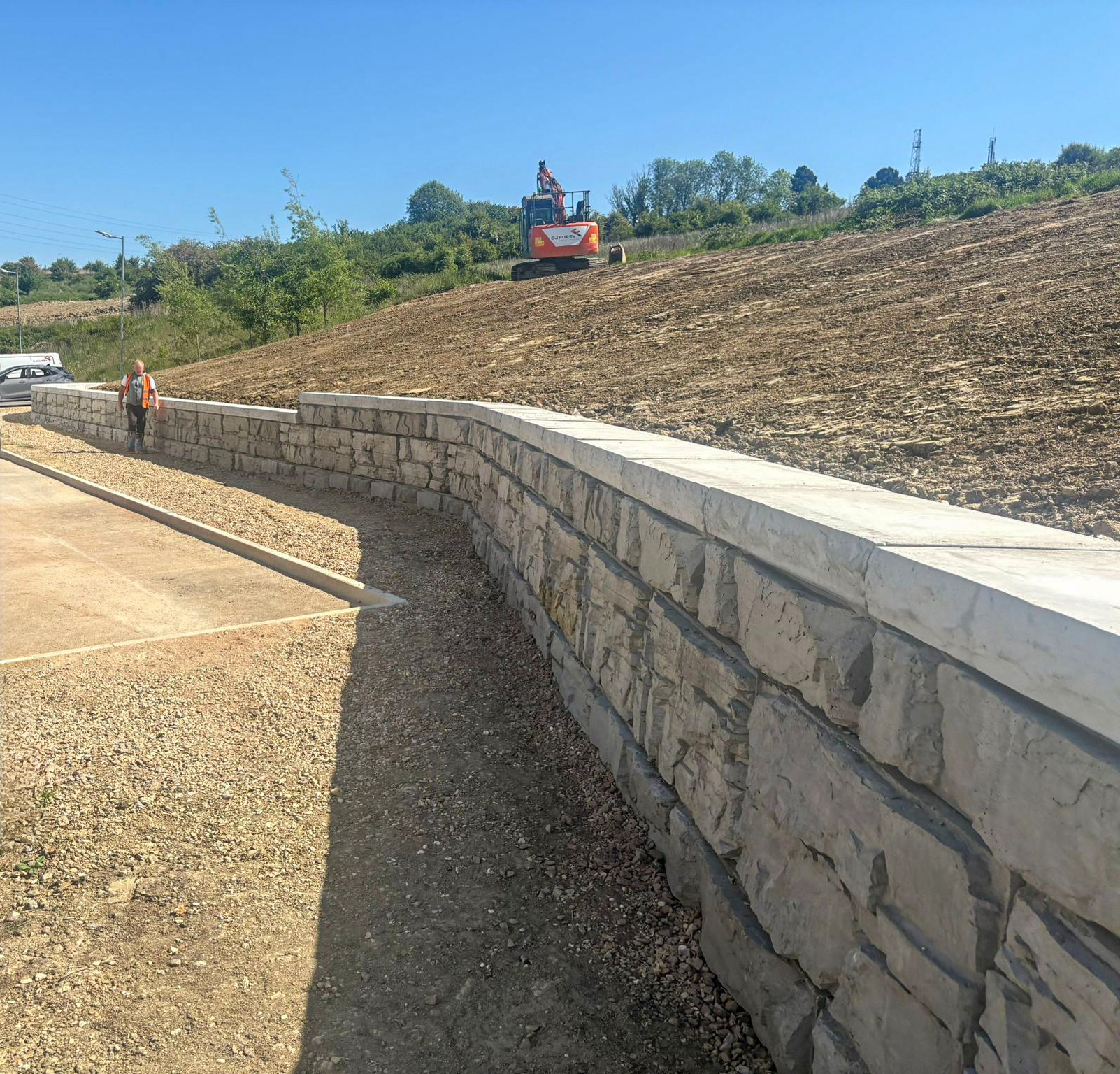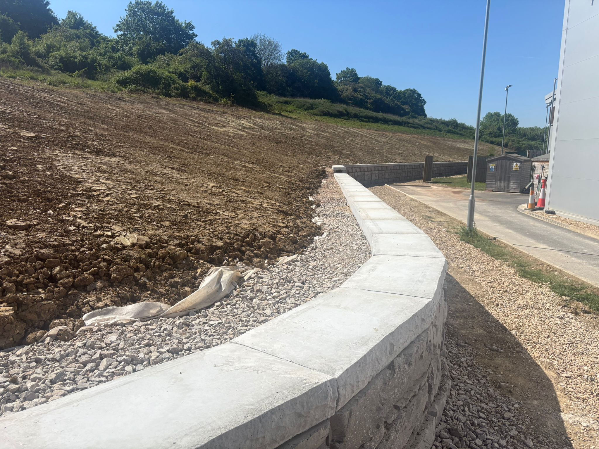 The Towers Health & Racquets Club is a premier leisure facility in Bedford, UK. As part of a 2025 renovation, the facility required a retaining wall to reinforce a hillside adjacent to its property. Apart from its primary structural strength, achieving a natural appearance was an added benefit, to match the club’s upmarket environment. MagnumStone was chosen for its hollow core design, exceptional drainage capabilities, and rugged natural stone finish.